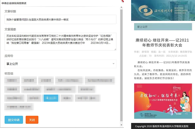 在醫院內容管理系統基礎上開發一套接入企業微信的系統。能夠將內容管理系統中的文章推送到企業微信指定的應用號中。可選不同應用,不同用戶標簽做到信息資源的定向推送。擁有審核機制,普通用戶申請推送,管理員審核通過后發起企業微信消息推送。極大改善了普通信息資源發布后用戶被動閱讀的弊端。